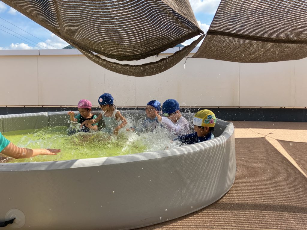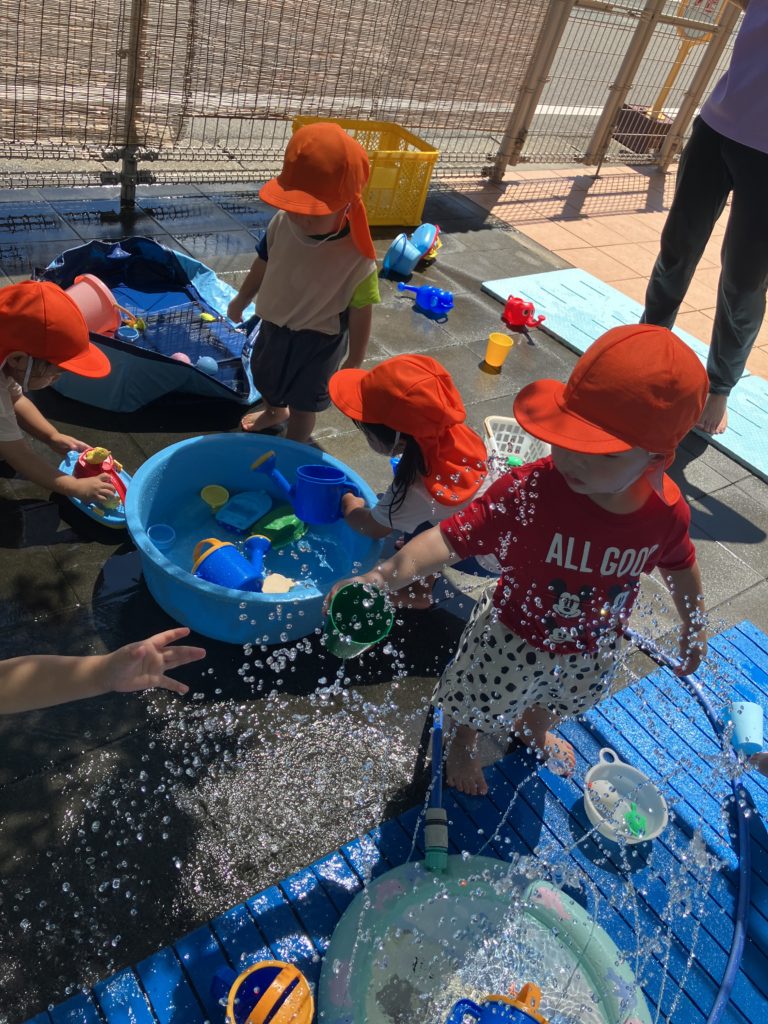 7月から8月の間に未満児さんは水遊び、以上児さんはプール遊びをしました!