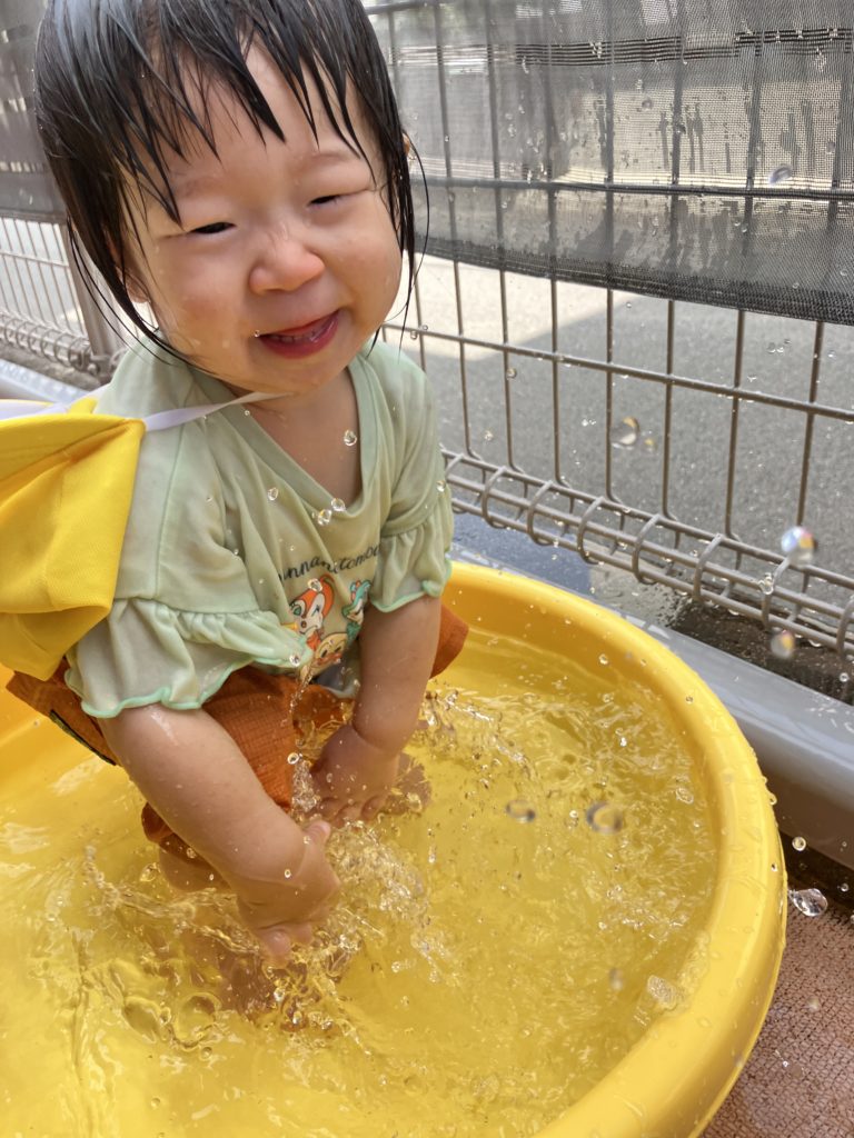 0歳児クラスのたんぽぽ組は、テラスにでて日光浴したり、タライに水にいれて少しずつ水に触れていきました♪